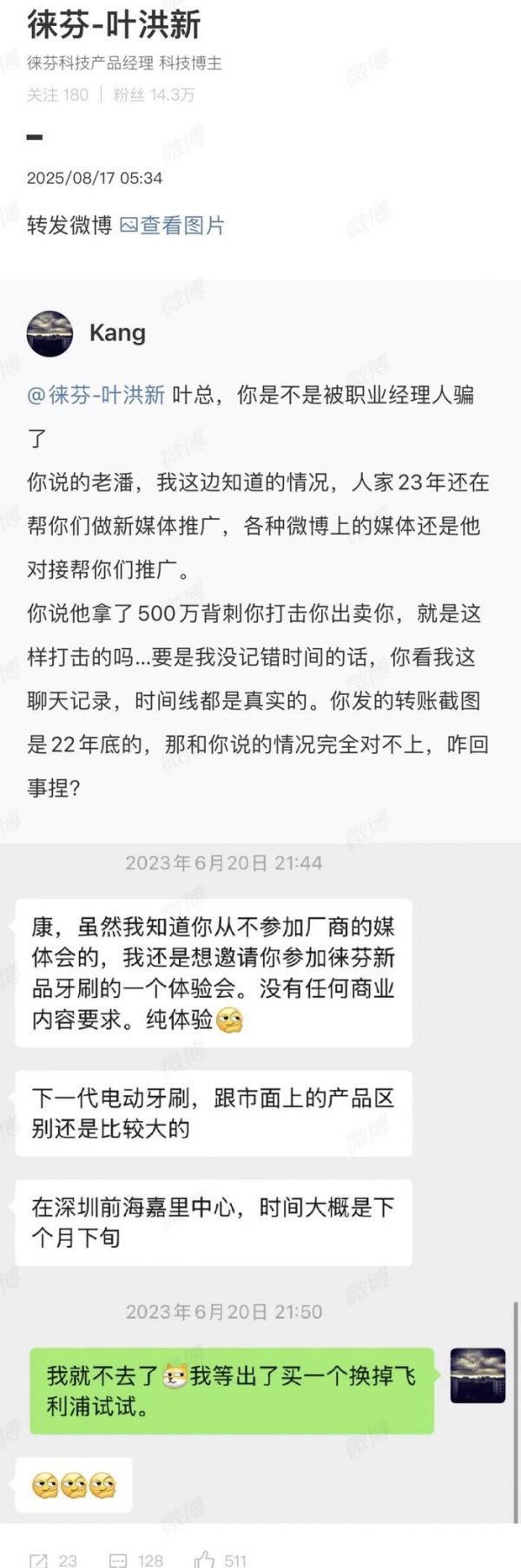 大概是有疑似认识潘坚的网友发文称,叶总,你是不是被职业经理人骗了,你说的老潘,我这边知道的情况,人家23年还在帮你们做新媒体推广,各种微博上的媒体还是他对接帮你们推广。