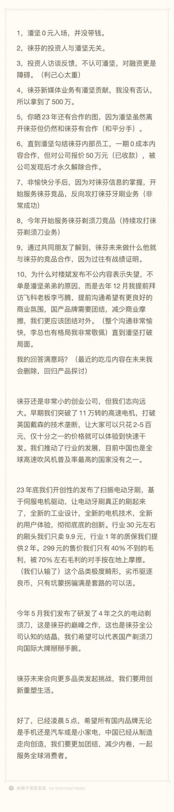 比如叶洪新称潘坚0元入场,徕芬的投资人与潘坚无关,投资人称不认可潘坚,更是融资的阻碍,利己心太重