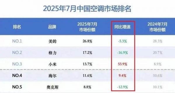 第二,小米作为后来者,已经在空调领域取得了巨大成功。刚刚过去的7月,中国空调市场排名中,小米已经位居第三,超越了海尔,仅次于美的和格力。