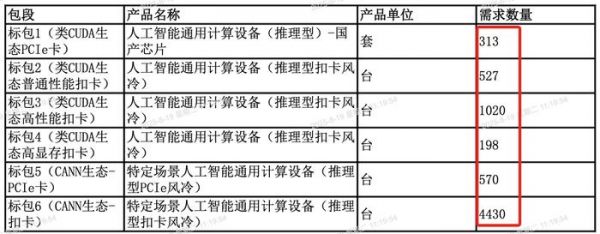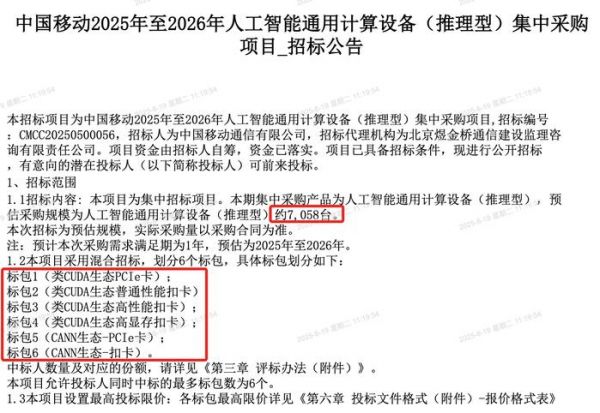这6个标包内容包括2058套类CUDA生态设备和5000套CANN(华为昇腾异构计算架构)生态设备。具体包括:313套类CUDA生态PCIe卡设备(标包1)、527台类CUDA生态普通性能扣卡设备(标包2)、1020台类CUDA生态高性能扣卡设备(标包3)、198台类CUDA生态高显存扣卡设备(标包4),以及570台CANN生态-PCIe卡设备(标包5)、4430台CANN生态-扣卡设备(标包6)。