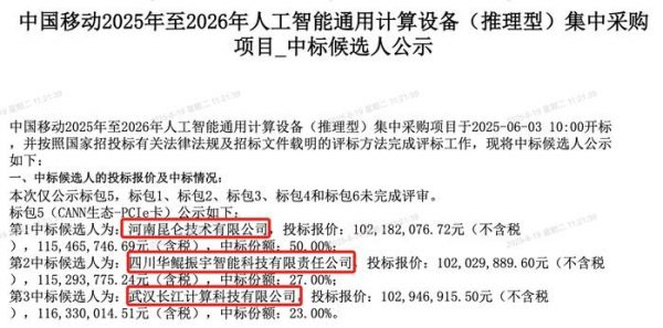 这应该是2025年迄今为止金额规模最大的AI服务器大单,前后分3次公布中标结果,约51.12亿元项目由9家企业分食:中兴通讯(8.85亿元)、新华三(5.49亿元)、浪潮(2.97亿元)、河南昆仑技术(8.38亿元,超聚变子公司)、四川华鲲振宇(6.67亿元)、武汉长江计算(5.98亿元)、宝德(4.95亿元)、软通(4.27亿元)、浙江华启智慧(3.56亿元)。