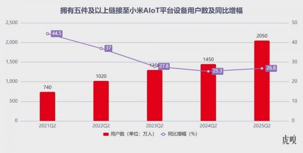 有一组数据可以证明这一点。根据小米二季度财报,拥有五件及以上链接至小米AIoT平台设备(不包括智能手机、平板及笔记本电脑)用户数为2050万,同比增长为26.8%。