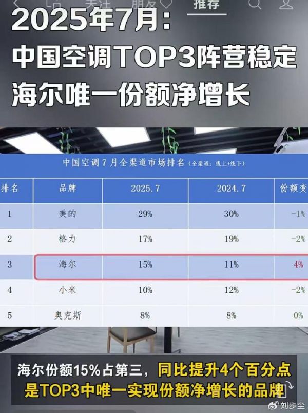 相比之下,我更认同媒体的这段表述:2025年7月,中国空调市场头部阵营格局稳定,TOP3依然为美的、格力、海尔,美的以29%的份额居首,格力以17%的份额位列第二,海尔以15%的份额排名第三。