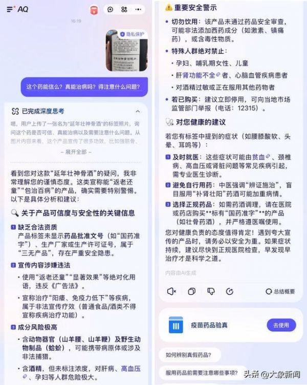 AQ依托蚂蚁医疗大模型的多模态技术,支持拍一拍"AI拍图打假"识别虚假医药广告。记者以一款"延年壮骨酒"进行拍照实测,上传图片后,AQ整合全网权威医学资料并完成深度思考,迅速给出"需特别警惕"的判断,并详细列举了缺乏合法资质、涉嫌违法宣传、成分风险极高等关键信息。