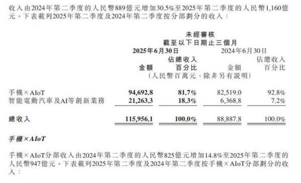 其中最为外界关注的小米汽车业务方面,财报显示智能电动汽车及AI等创新业务分部收入为人民币213亿元,其中,智能电动汽车收入为人民币206亿元,其他相关业务收入为人民币6亿元。本季度,智能电动汽车及AI等创新业务分部毛利率为26.4%。2025年第二季度,智能电动汽车及AI等创新业务分部经营亏损为人民币3亿元。2025年第二季度,交付新车达81,302辆。