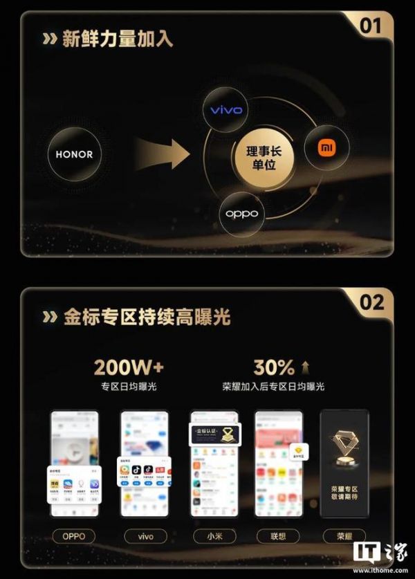 据介绍,荣耀新加入移动智能终端生态联盟,成为理事长单位;金标专区日均曝光 200W+、荣耀加入后日均曝光增长约 30%。