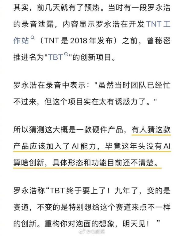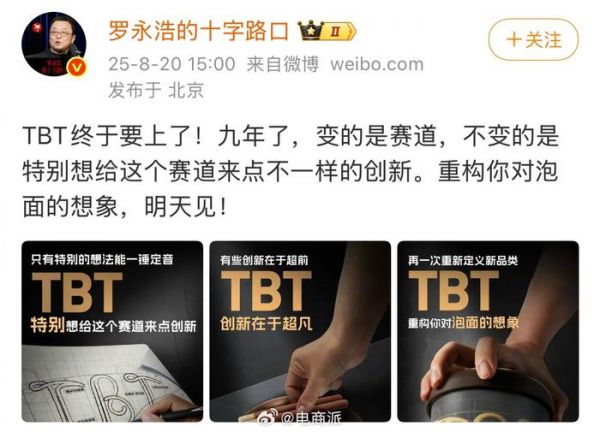 #罗永浩宣布将做泡面# 九年磨一面!罗永浩官宣TBT项目是泡面,曾称该项目间接导致锤子失败。