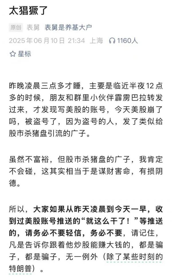 没多久,@表舅是养基大户 也发现,自己平时写美股的账号,给粉丝推了股市杀猪盘的引流广子。