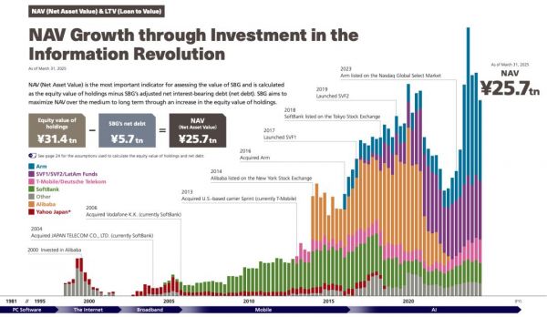 截至2025年6月26日,软硬的净资产价值约为31万亿日元,市值约为14万亿日元,大致是其资产价值的一半。(图源:软银2025财年财报,下同)
