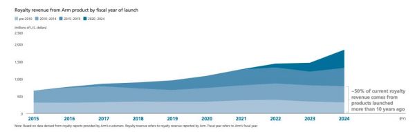 Arm 的商业模式有一个显著特征:一次授权,长期受益。客户在拿到 Arm 架构后,往往需要 2–3 年时间开发出成熟的芯片产品,而一旦成功,这些芯片会在市场上持续出货多年甚至数十年。因此,Arm 的授权收入不仅短期见效,更具备强大的“长尾效应”。截至 2024 财年,约 50% 的专利收入依然来自于 10 年前推出的产品。这种稳定的现金流,使 Arm 能够在智能手机、消费电子、汽车以及云计算等新兴市场持续扩张,同时投资 AI、机器学习和下一代技术。