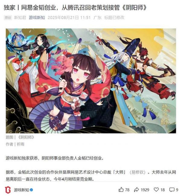 8月21日,据“游戏新知”公众号,阴阳师事业部负责人金韬已经离职创业。据悉,金韬此次创业的合作伙伴是原网易艺术设计中心总裁“大师”(易修钦)。大师去年从网易离职后一直在待业状态,今年4月刚结束竞业期。