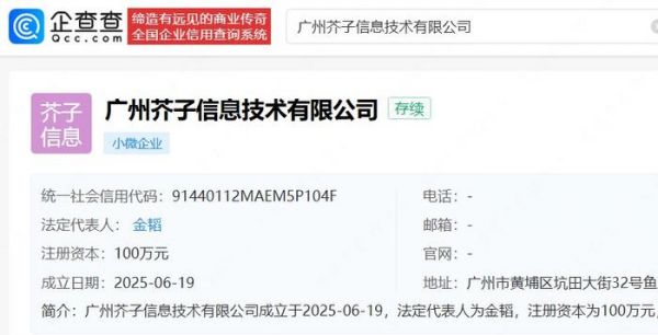 企查查APP显示,广州芥子信息技术有限公司成立于今年6月,法定代表人为金韬,注册资本100万人民币,经营范围包括计算机软硬件及辅助设备零售、电子产品销售、动漫游戏开发、互联网游戏服务等。