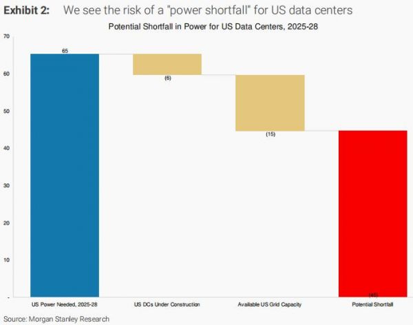 摩根士丹利以最直观的分析方式,将AI数据中心未来新增所需电力规模与现有可用电力的获取进度做直接比较,指出: