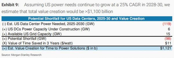 如果在2028年美国电力接入方面有约45GW的缺口,根据摩根士丹利分析,3年的时间优势价值约11美元/Kw,那么“时间供电”解决方案提供商能够产生约5000亿美元的价值。