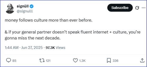 而在X网站(原推特)上有一个长期观察商业的大V名叫Signüll,他说了这样一段话:金钱比以往任何时候更加追逐文化。如果你的普通合伙人(GP,即资金管理人)不懂“互联网+文化”,你会错过未来十年。