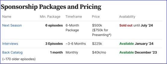这三种赞助形式基本都是很早就被预定一空。由于每集内容都可以放3个赞助商,所以加起来,2023年Acquired的赞助收入就超过了300多万美元。