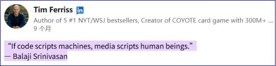 在科技、投资和加密货币领域都很有影响的技术思想家兼投资人Balaji Srinivasan说:如果代码是机器的脚本,那么媒体就是人类的脚本。