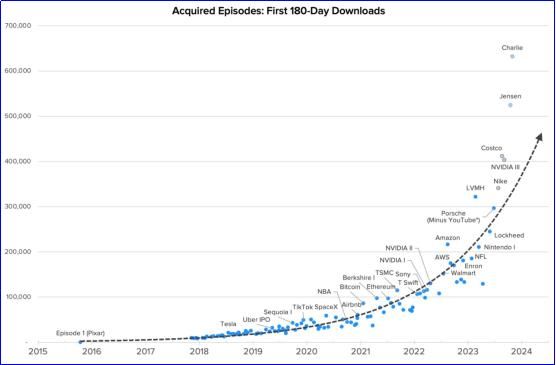 此后,2022年超过10万,2023年超过20万……每一年,Acquired的每集节目播放量都在翻倍。