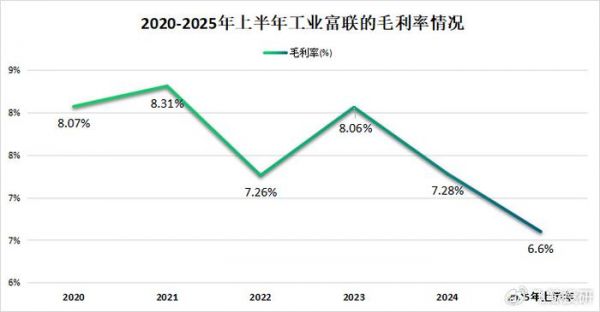 而且随着工业富联低毛利的云计算业务的营收比例逐步扩大,公司整体的毛利率也被进一步拉低,2025年上半年降到了6.6%,比2024年底减少了0.68个百分点,盈利压力肉眼可见。