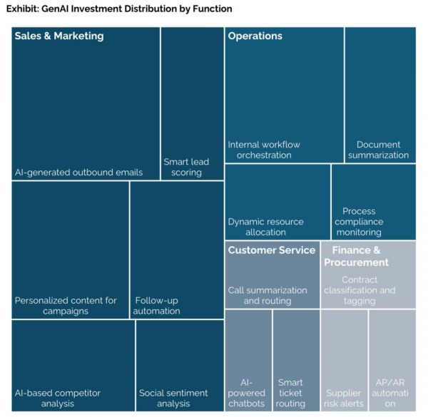 在GenAI投资上,也显著偏向于成果更可见的前端职能,例如营销邮件AI生成工具、智能评分等,而一些难以用直观数据体现的后端AI却资金受阻,如采购、财务、法律等,却往往被投资者忽视,而这些才是高ROI项目。