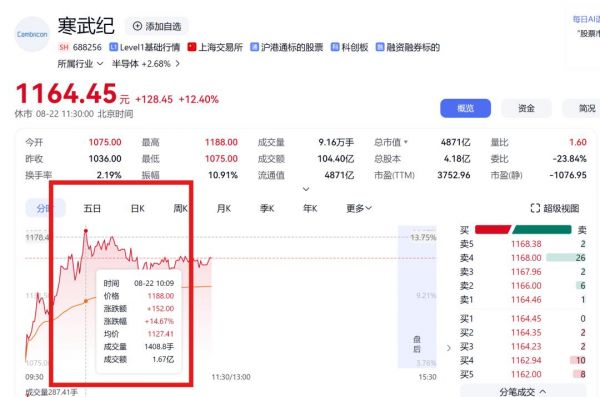 截至今日10:25,寒武纪盘中大涨近14%,总市值超4940亿元,超过中芯国际跃居科创板头名(实际以最新为准)。
