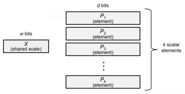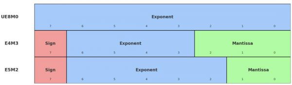 而这里的“缩放因子”也是包含8个bit,其中包含符号位、指数位和尾数位,开发者可以自行将这8个bit分配给这三种不同的位。