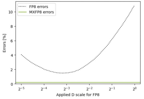 这种块级(而不是全张量级)的缩放,让MXFP8既保留了8 bit位宽,又把可用动态范围扩展了几十倍。