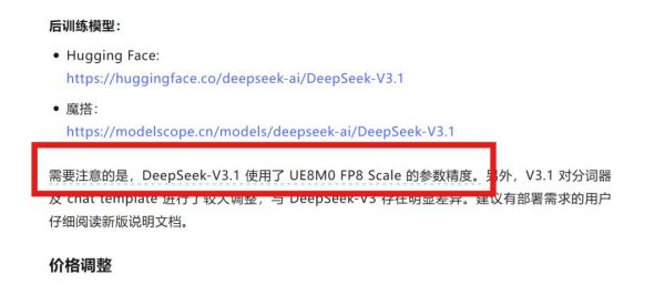 需要注意的是,DeepSeek-V3.1使用了UE8M0 FP8 Scale的参数精度。
