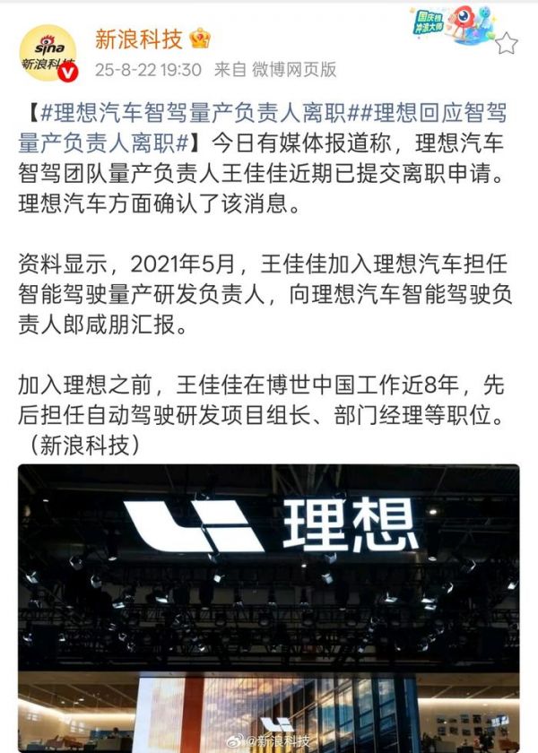 另据新浪科技,理想方面确认了王佳佳离职的消息。