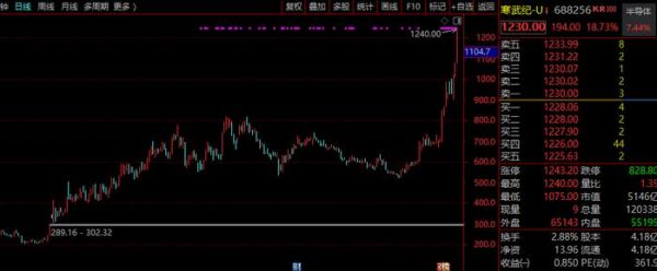 今日国产AI芯片龙头寒武纪强势爆发,盘中最高触及1240.00元,涨幅超19%,市值突破5000亿元,超过五粮液、美的、兴业银行等知名公司。成交额超130亿元,市场交投异常活跃。