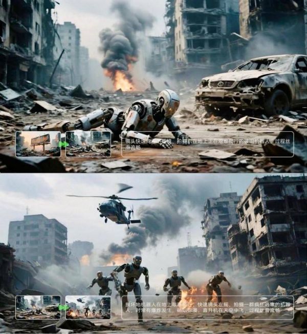 可灵2.1首尾帧可以支持电影级复杂运镜,通过首尾帧连续衔接,实现镜头轨迹与场景逻辑的高度匹配。例如,在模型连续生成的这两个视频中,镜头先快速向左下摇镜,突出趴在地上爬行的破旧机器人,随后快速左摇,拍摄逃窜机器人与爆炸场景……整个过程镜头调度一气呵成,过程丝滑流畅。
