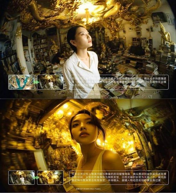 可灵2.1模型首尾帧功能的核心突破之一,是解决AI视频生成中常见的转场难题,如场景衔接生硬“刹车感”强等。测试视频中,一名年轻亚洲女性从堆满书籍与佛像的房间转身,镜头推进至金色装饰逐渐增多的空间……过程中,角色发型(长发自然垂落转为侧梳)、服装(白色长袖衬衫变为无袖上衣)、光线(暖光由散射转为聚焦)均实现无缝衔接,场景切换逻辑清晰连贯。