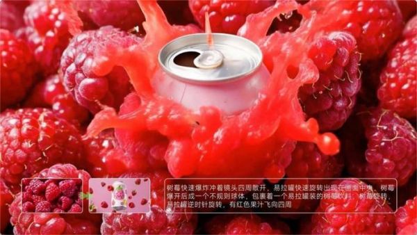全面升级后的首尾帧功能还可快速生成符合品牌调性的创意展示视频,广泛适用于市场营销等领域,显著降低素材制作成本。例如,在这个饮品广告案例中,易拉罐快速从树莓中飞出,周围的树莓如爆炸般散开,果汁向四周飞溅,整个过程丝滑自然,给观众带来身临其境的沉浸式体验。