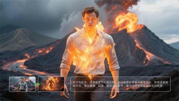 此次可灵2.1首尾帧可实现强烈的视觉冲击效果,助力轻松打造超燃视觉特效。实测视频中展现了极具张力的人物变身过程,人物轮廓在深蓝背景中逐步蜕变为纯火焰形态,火山岩浆流动、星空背景下的烈焰升腾等细节均清晰呈现,节奏与危险紧张的氛围高度匹配,体现出模型对复杂视觉元素的精准控制。