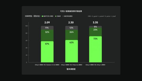 专业评估人员对可灵2.1、可灵1.6、Seedance1.0 mini、Midjourney等模型的首尾帧功能进行了客观的效果评测。结果显示,可灵 2.1首尾帧在整体效果及多个细分维度上均表现优异,与Seedance1.0 mini 对比的整体GSB得分达到2.09,与Midjourney对比的整体GSB得分达到2.30,与可灵1.6对比的整体GSB得分达到3.35。同Midjourney、Seedance1.0 mini 进行两两偏好对比显示,可灵2.1首尾帧的胜率分别达到62%、57%。