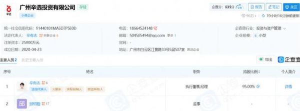 《21CBR》记者注意到,辛选核心子公司“广州辛选投资”,仍由辛巴实控,持股95%,初瑞雪未持股,也没担任职务。