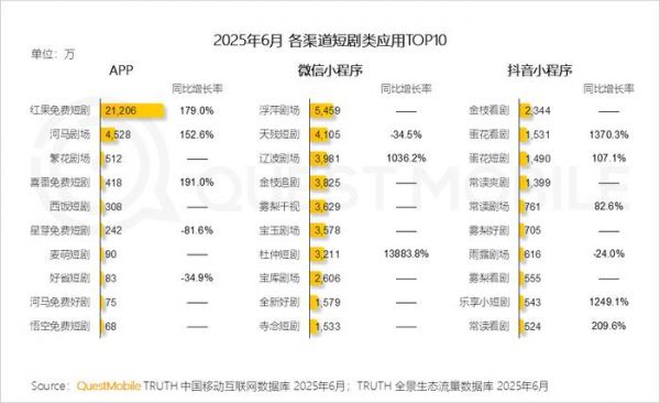 Questmobile最新数据显示,截至2025年6月,红果免费短剧的用户规模同比增长率高达179.0%,月活用户达2.1亿。短剧应用排行榜断层第一,第二为河马剧场,月活约为4528万,其余均在百万左右。这份报告中,爱奇艺极速版并未上榜。