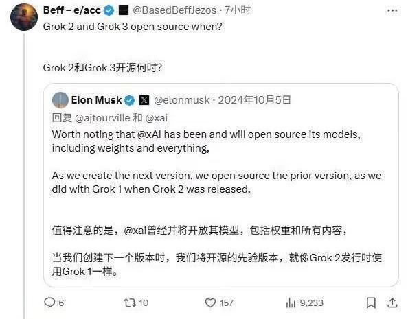 截图为埃隆·马斯克在X平台上回复网友“是时候开源Grok 2了。”