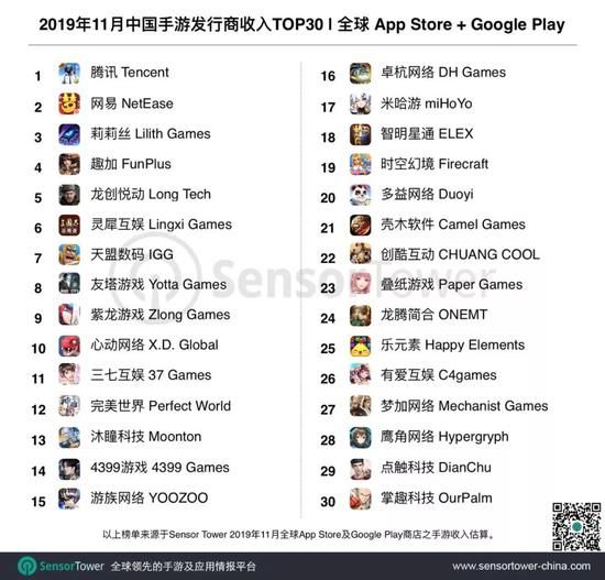 11月中国手游发行商全球收入排行榜:腾讯第一