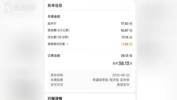 记者从美团打了辆网约车,接单的是享道的司机,到目的地后,券后实付38.13元,而司机端收款26.62元,抽佣比例超30.1%。网约车司机无奈道:“这抽成实在太高了,30%啊!想挣700块钱,你就得跑上十三四个小时,不然根本赚不到钱。”