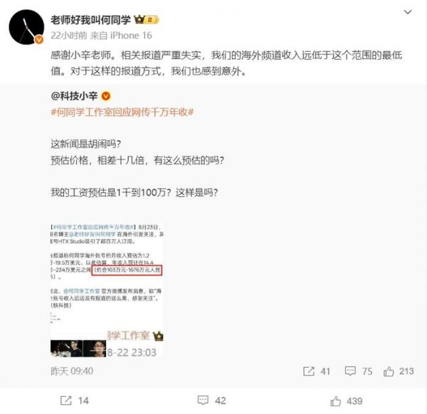 图源:小红书但就在8月24日,何同学马上出来辟谣说这个海外频道收入远不及网上所传收入范围的最低数额。