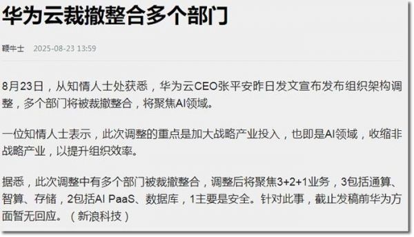 上周五,华为云CEO张平安亲自发文要大收缩,产品部、公有云服务部、研发部都有影响,而下边几十个小部门都会调整,预计上千人要受影响。理由很简单:聚焦AI,收缩非核心业务,目标就是兑现2024年的承诺——2025年盈利。