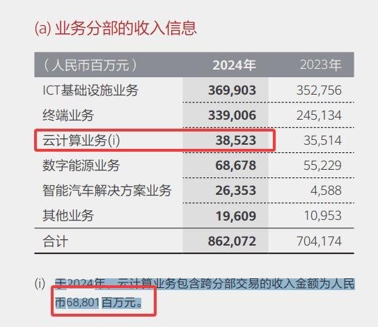 (图为华为2024年报,就这个问题我琢磨了半天,我在网上搜的媒体网站都说华为云收入688亿,结果看了年报才知道根本没有)