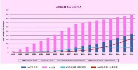 ABI Research此前发布的一份报告显示,到2036年全球5G专网支出将超过5G公网,这一预测似乎更为激进。若按ABI Research的预测,到2026年蜂窝无线专网资本支出将超过2000亿美元。