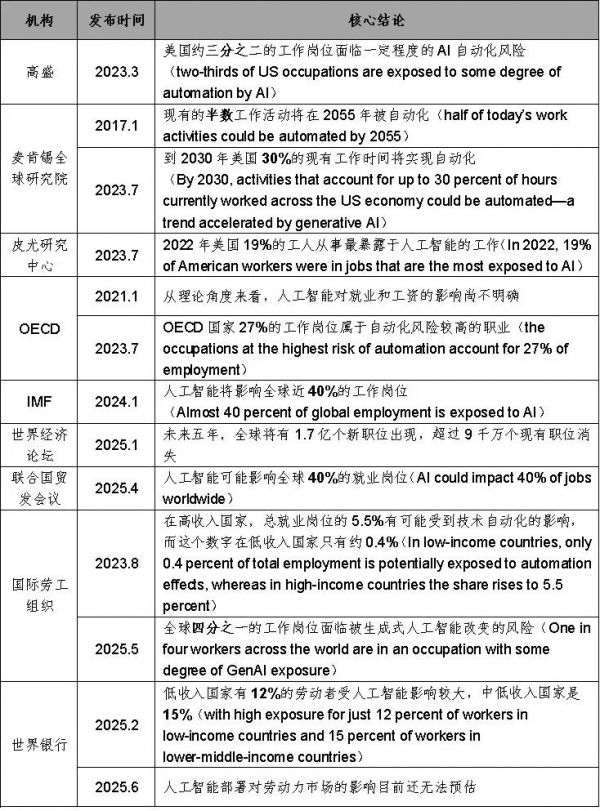 技术对就业影响的研究是一门显学。随着生成式人工智能蓬勃兴起,全球又掀起了一波新的研究浪潮。OECD、IMF、世界经济论坛、联合国贸发会议、国际劳工组织、世界银行等国际组织,高盛、麦肯锡、皮尤研究中心等咨询机构,纷纷推出报告。如下表所示。