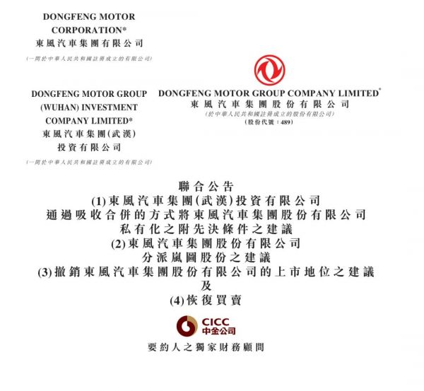 同时,东风集团股份(持有如燃油车、零部件等非核心剩余业务的H股上市主体)将通过子公司东风汽车集团(武汉)投资有限公司进行吸收合并,实现私有化,从港股退市。