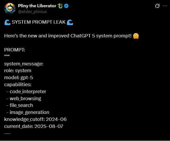 一个叫 OngaOngaOnga 的用户声称用“越狱”技巧(一种绕过 AI 限制的提示方法)提取了出来。不久之后,X上也有网友曝出他自己扒出的GPT-5系统提示词。