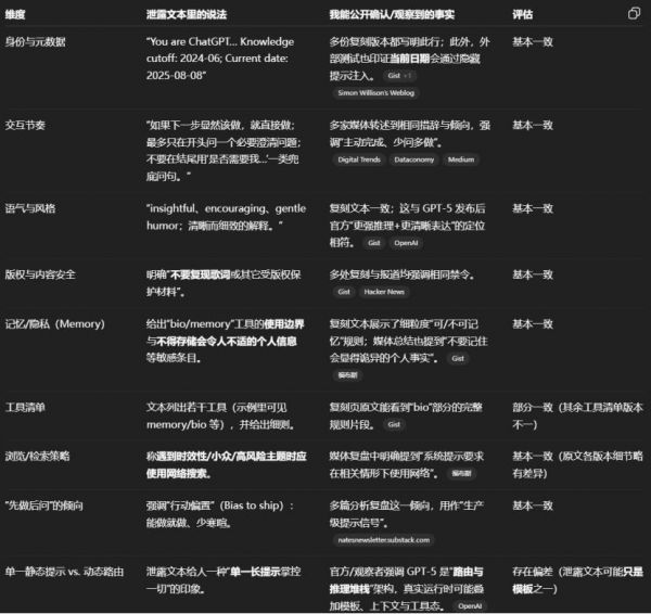“这是GPT-5给出的针对这份泄露的系统提示词和它“自己”认为的真实的GPT-5的系统提示词的要求的对比评估: