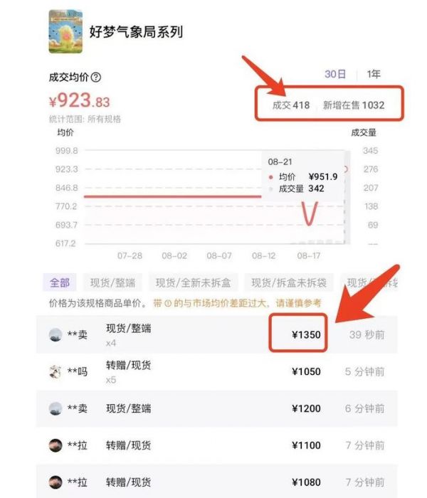 例如在某潮玩社区平台上,星星人今日最新整盒成交价达到1350元,溢价约3倍,单个平均价约150元,溢价约2倍,隐藏款价格高达478元,溢价更是超过6倍。有人直呼“这么贵到底是谁在买”“简直比黄金还离谱”。