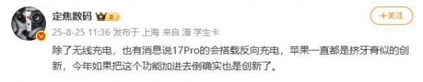 据博主@定焦数码爆料,iPhone 17 Pro 将首次支持这个功能。可能有朋友会说这不就是把手机当无线充电器用吗?有啥新鲜的?但对苹果来说,这个迟到七年的功能终于来了。